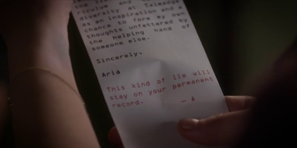 Así que sólo un par de episodios anteriores, las chicas se enteran que Ali había vuelto realidad a Pensilvania mucho antes de lo que pensaban. Un amigo llamado Duncan la llevó en su avión en un campo de aterrizaje llamado Dougherty's. Mientras buscan en la bolsa de las cosas de Ali que le dio a Jason, encuentran una tarjeta (2x24) y esta pluma (2x25).